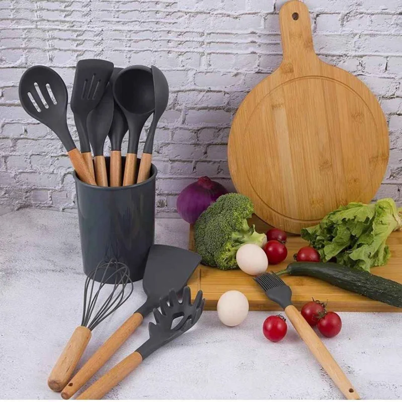 سرویس کفگیر و ملاقه kitchen set شاخته شده از بهترین و با کیفیت ترین مواد سیلیکونی با استاندارد FDA و بدون موادBPM ،با تحمل گرمای بسیار بالا تا 230 درجه سانتی گراد، دسته های چوبی از جنس بامبو و یک ظرف نگهدارنده زیبا می باشد.آشپزی یکی از لذت بخش ترین کارهای منزل است البته در صورتی که لوازم آشپزخانه با کیفیت با کارایی بالا و استفاده آسان در این امر به ما کمک کنند.این سرویس یکی از مورد نیاز ترین های هر آشپزخانه می باشد. با سرویس 12 پارچه کیچن ست هر آنچه که از کفگیر،ملاقه،انبر،همزن و ... نیاز دارید در دسترس شماست وبا کمک این سرویس شما عاشق آشپزی خواهید شد.سیلیکون به کار رفته در این محصول ساخته شده از مواد غیر سمی،بی بو و سازگار با محیط زیست می باشد.انعطاف پذیری و رویه ی نرم این سرویس از خراشیدگی و آسیب رسیدن به ظروف حساس و تفلون شما جلوگیری می کند.