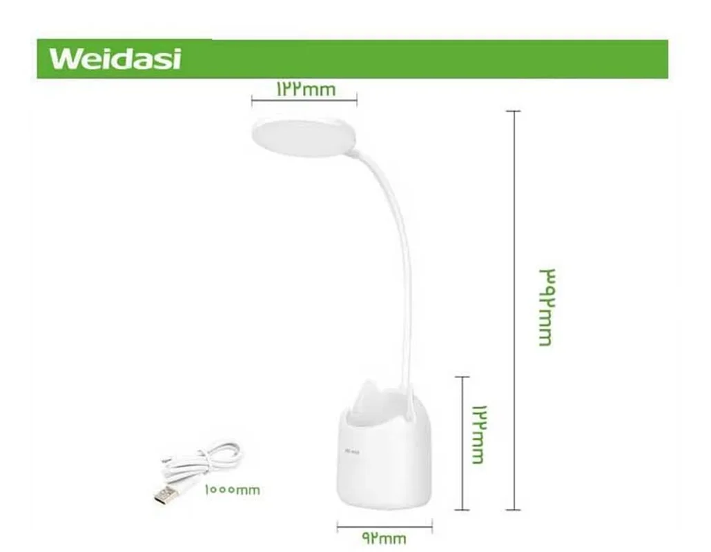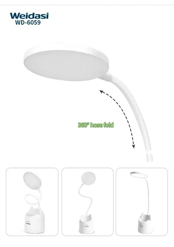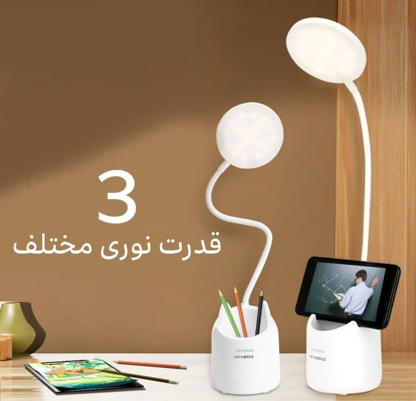 💥چراغ مطالعه ویداسی مدل ۶۰۵۹✅️شارژی🤩دارای میله منعطف برای تنظیم زاویه با قابلیت چرخش 360 درجه😍😍 این محصول دارای دیمر با سه قدرت نوری است که با نگه داشتن دکمه لمسی میتوانید میزان نور را تنظیم کنید✅️👌 دارای سه نور آفتابی, مهتابی و ترکیبی🤩👌نگهداری شارژ طولانی مدت👈شارژ با کابل USB🔶️درهنگام شارژ چراغ نشانگر قرمز و پس از شارژ کامل سبز می شود.👈زمان لازم جهت شارژ کامل حدود ۳.۵ ساعت 👌😍 همچنین دارای پایه نگه دارنده گوشی موبایل نیز میباشد.