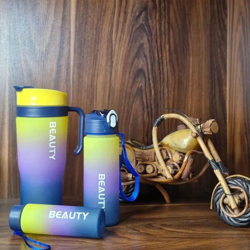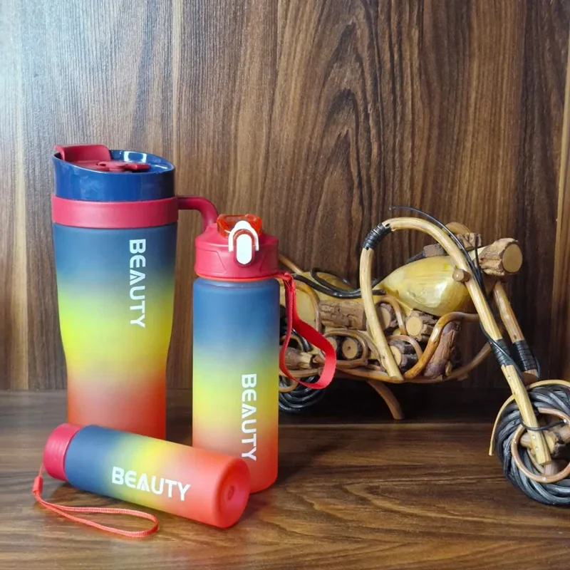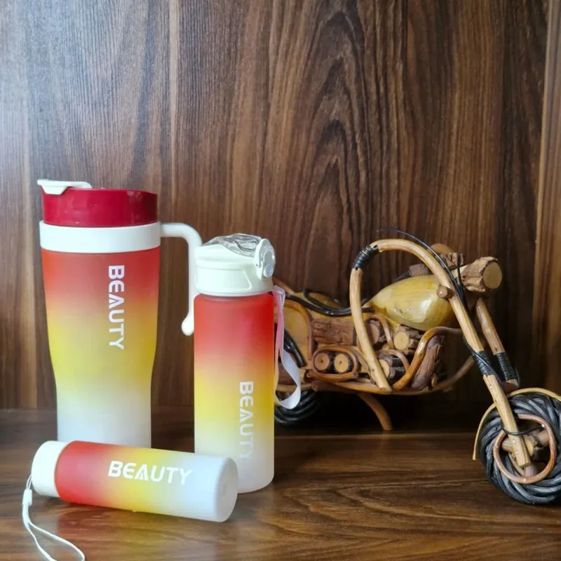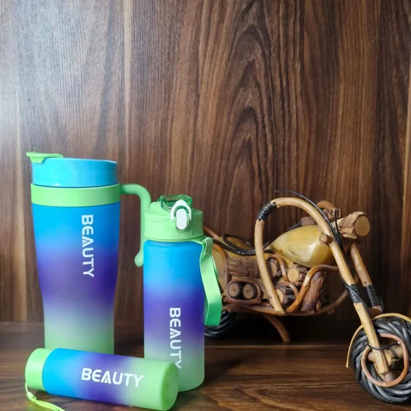دارای سه قمقمه در سایز های مختلف/سایز 1: 1300میلی لیتر-سایز 2: 800 میلی لیتر- سایز3: 300 میلی لیتر/بدون هیچگونه نشتی/سایز یک و دو دارای نی می باشند- سایز یک دارای دو درب ،آسان نوش و نی دار می باشد.سایز یک دارای دسته و سایز دو و سه دارای بند می باشند.